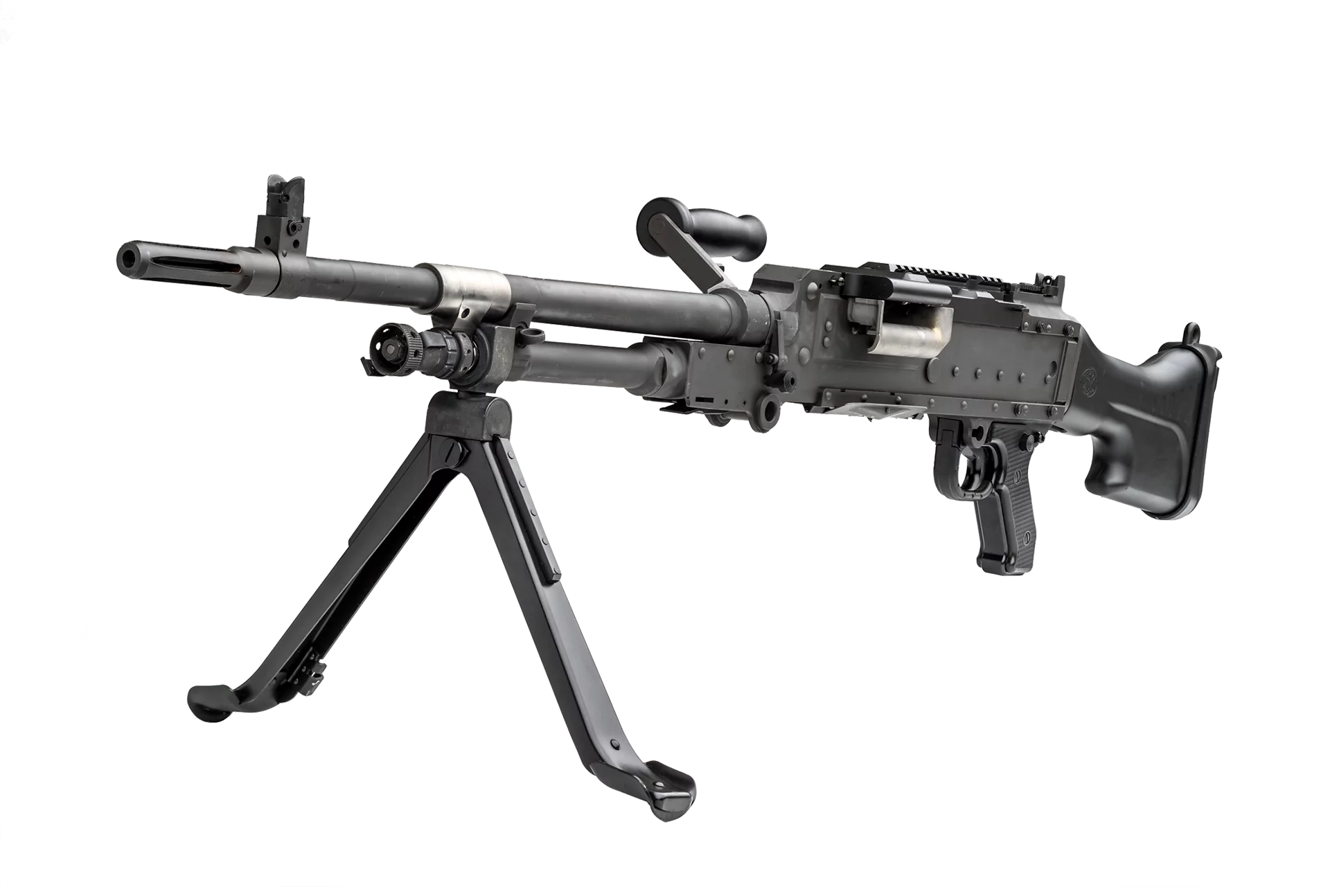 Renowned worldwide for reliability and versatility, it fires belt-fed ammunition with an adjustable gas regulator and rates of fire between about 650-1,000 rpm, can be deployed on bipods, tripods, and vehicle or naval mounts, includes iron sights and a MIL-STD-1913 rail for optics, and serves in infantry, vehicle, and aircraft roles in more than 80 countries.