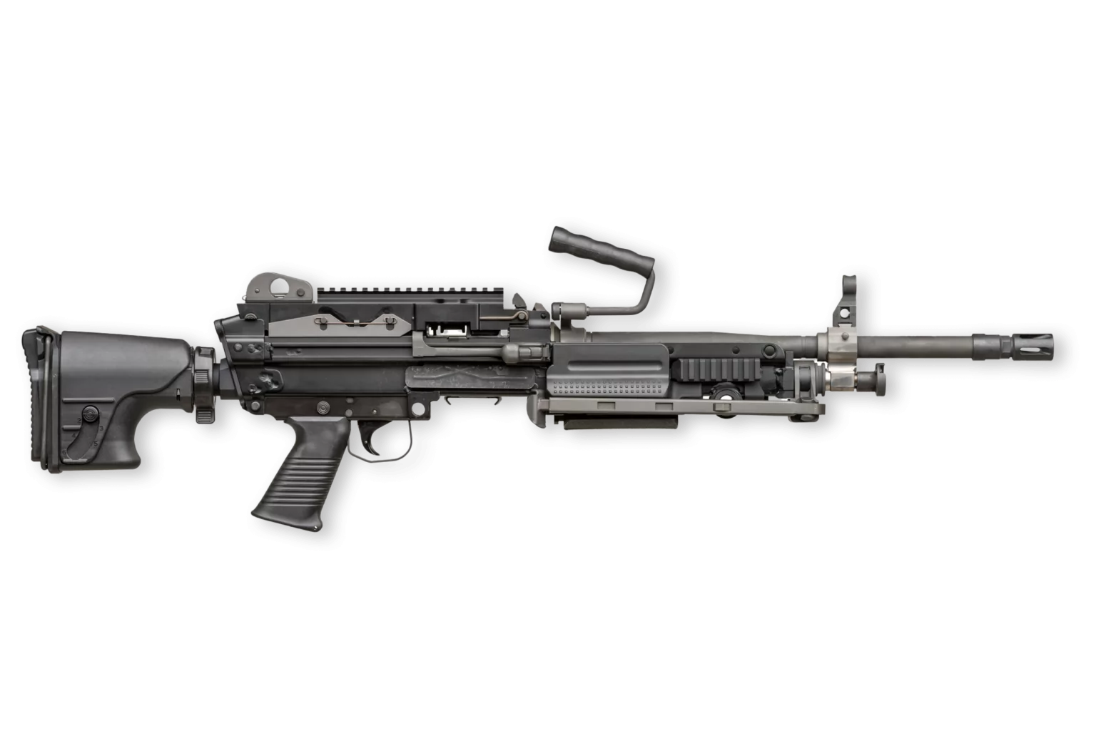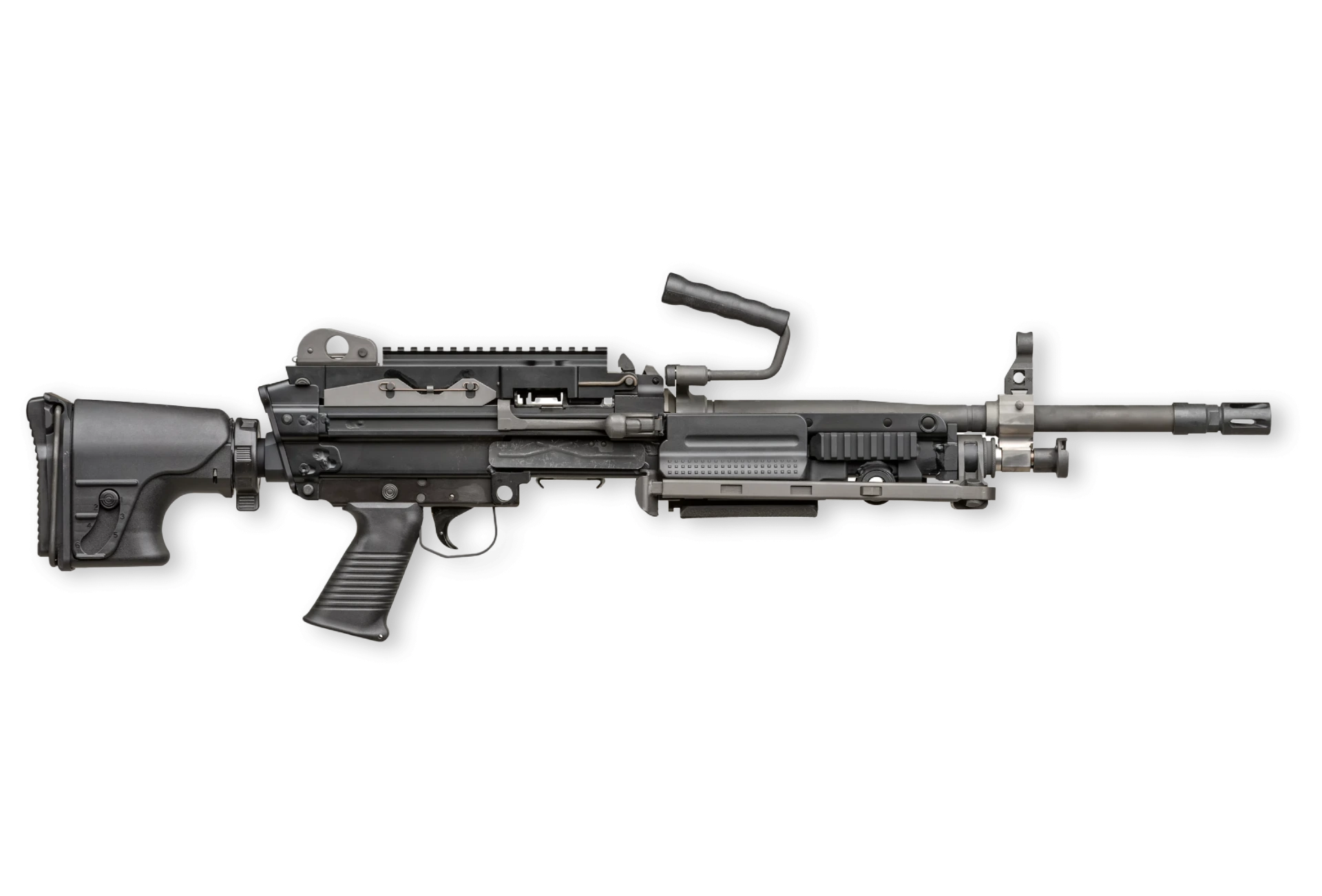 Designed for sustained automatic fire in squad support roles, it includes an adjustable buttstock with multiple length and cheek-height positions, an integrated hydraulic buffer, a bipod that functions even with accessories mounted, a long-rail feed cover for optics, and a belt or pouch feed system delivering about 800 rounds per minute.