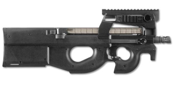 The FN P90 Tactical is a compact, lightweight bullpup personal defense weapon built with impact-resistant polymer and a top-mounted 50-round magazine chambered in 5.7×28 mm NATO, maintaining the distinct ergonomic layout and fully ambidextrous controls of the P90 platform.