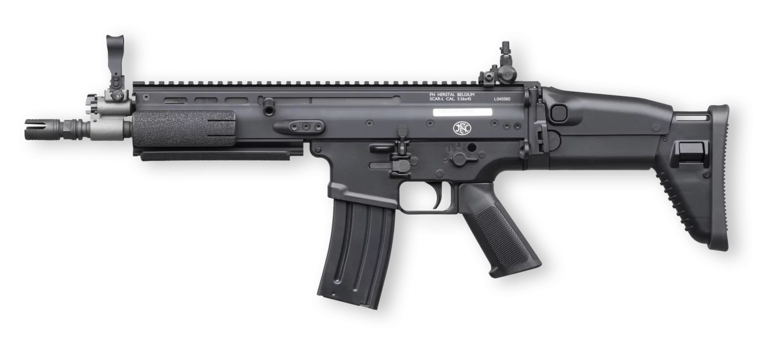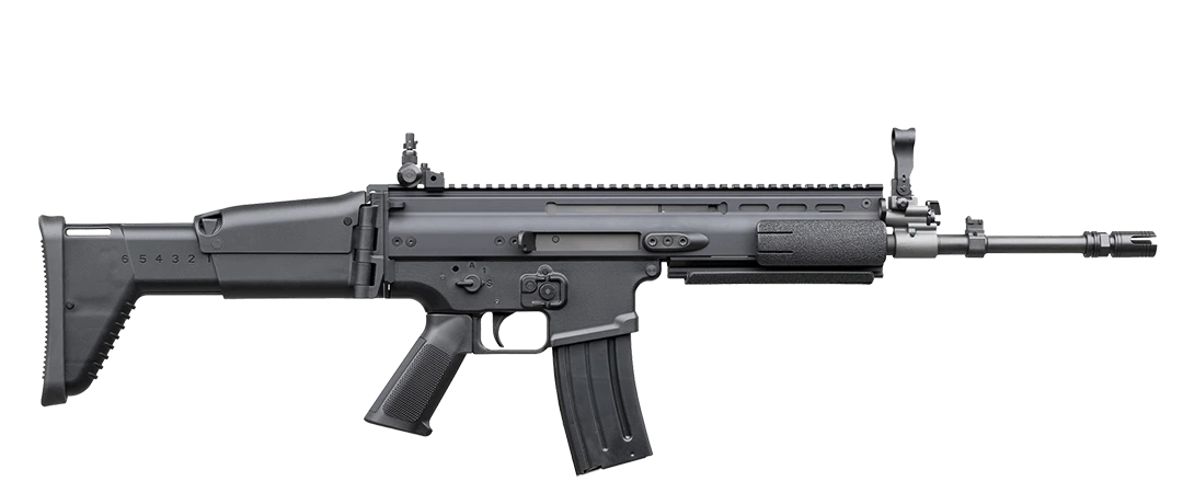 The FN SCAR L is a modular 5.56×45 mm NATO assault rifle built on an aluminum alloy receiver with a high-strength polymer lower, featuring a short-stroke gas piston system, interchangeable barrels, and a folding, adjustable buttstock for adaptability across mission profiles.
