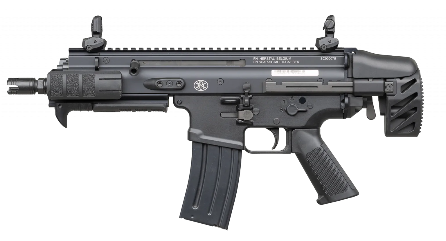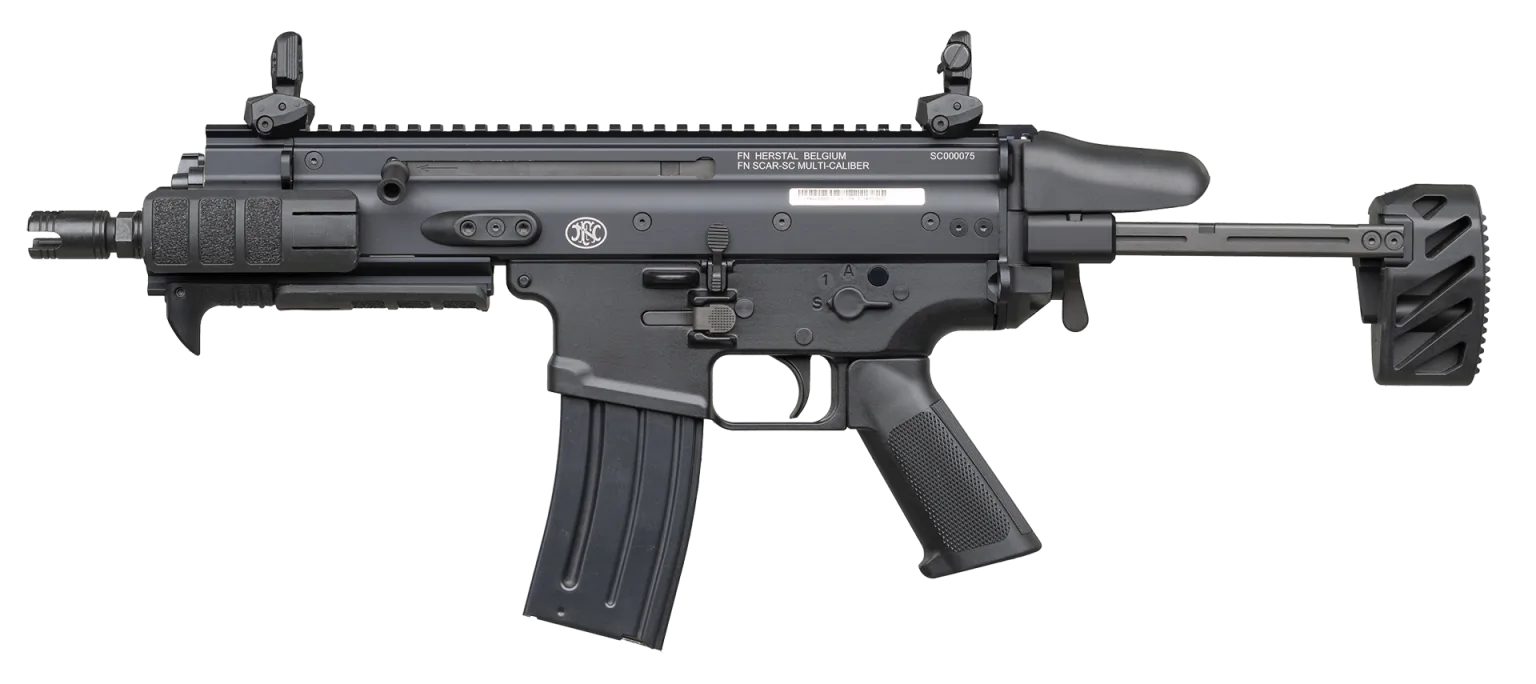 The FN SCAR SC 5.56 is a compact, rugged carbine built by FN Herstal with a short-stroke gas piston system on an aluminum alloy receiver and steel barrel, featuring an adjustable telescoping stock and MIL-STD-1913 Picatinny rails for accessories.