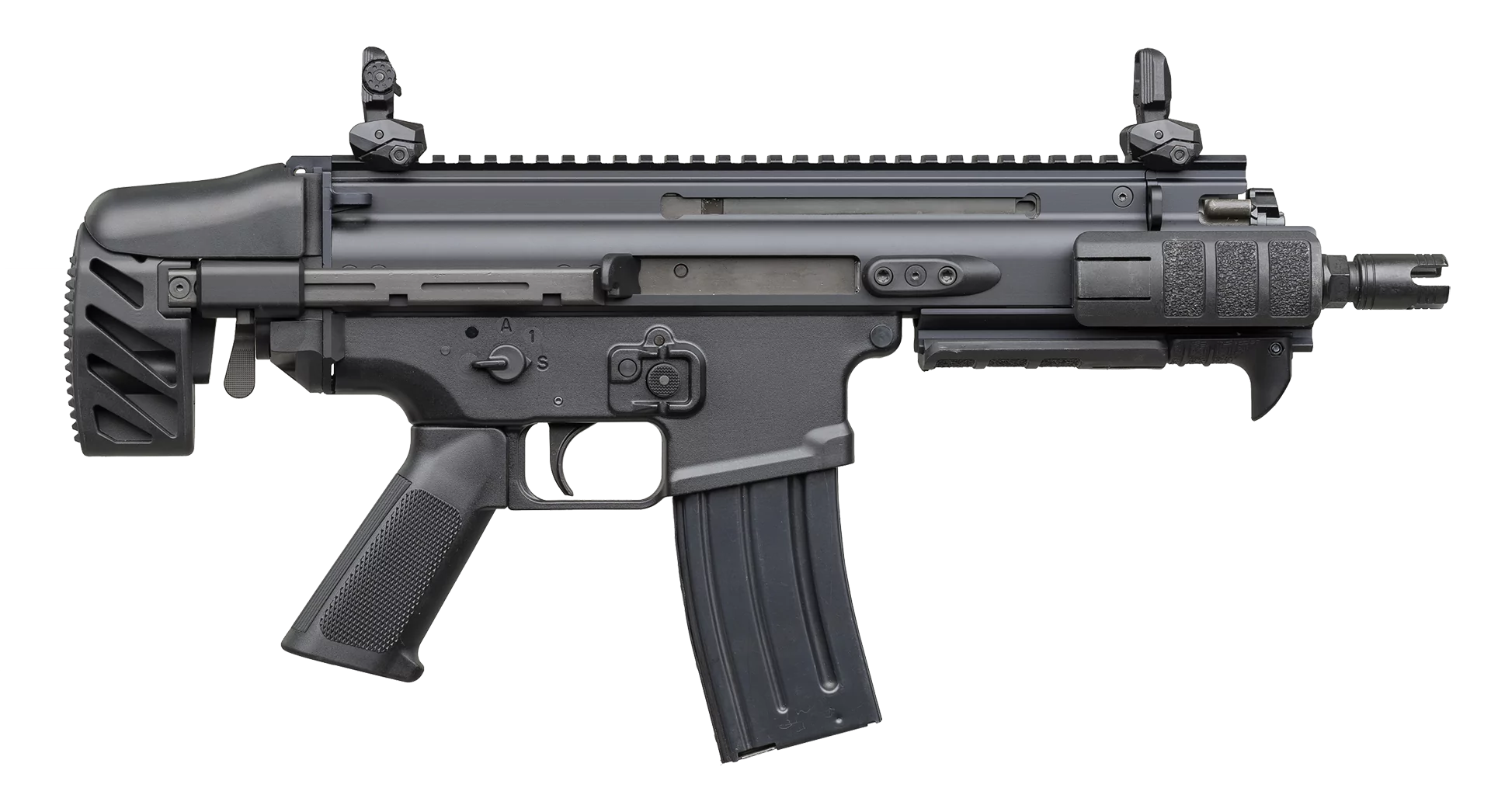 Designed for tactical and close-quarters engagements, it fires 5.56×45 mm NATO from a 30-round magazine, offers semi-automatic or selective fire options, non-reciprocating controls, multiple accessory rails, and interchangeable stock configurations to suit mission needs.